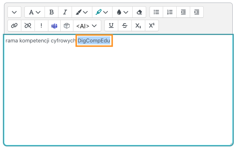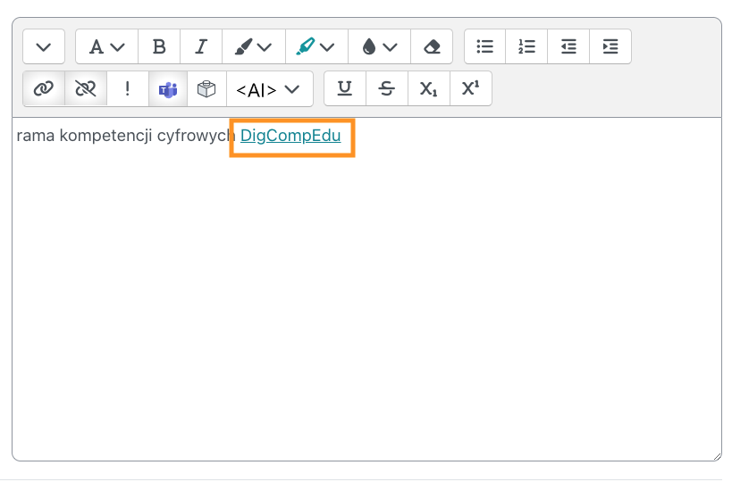 Krok 1: w polu tekstowym zaznaczyć ten fragment, do którego chcemy podlinkować konkretny dokument tekstowy, a następnie kliknąć w ikonę linku,