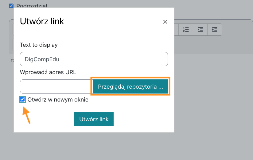 Krok 2: aby link do dokumentu został utworzony należy go ściągnąć przez Przeglądaj repozytoria i zaznaczyć opcję Otwórz w nowym oknie,