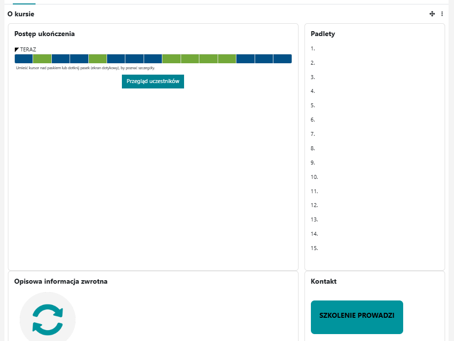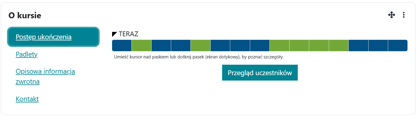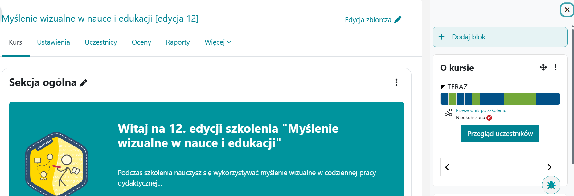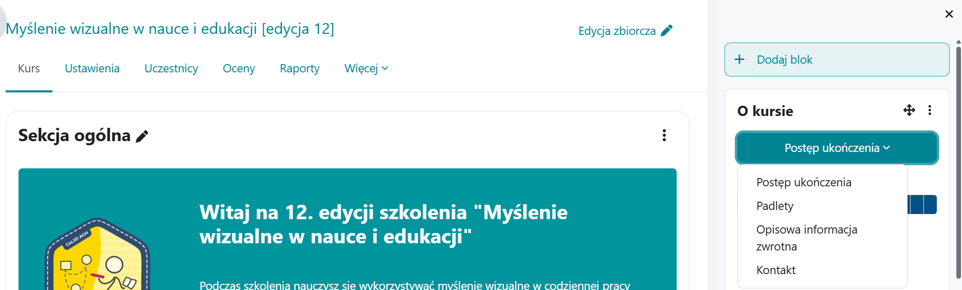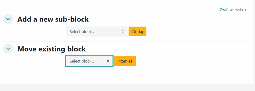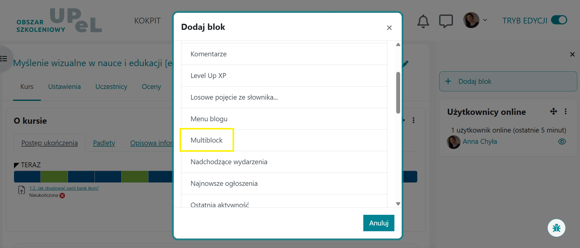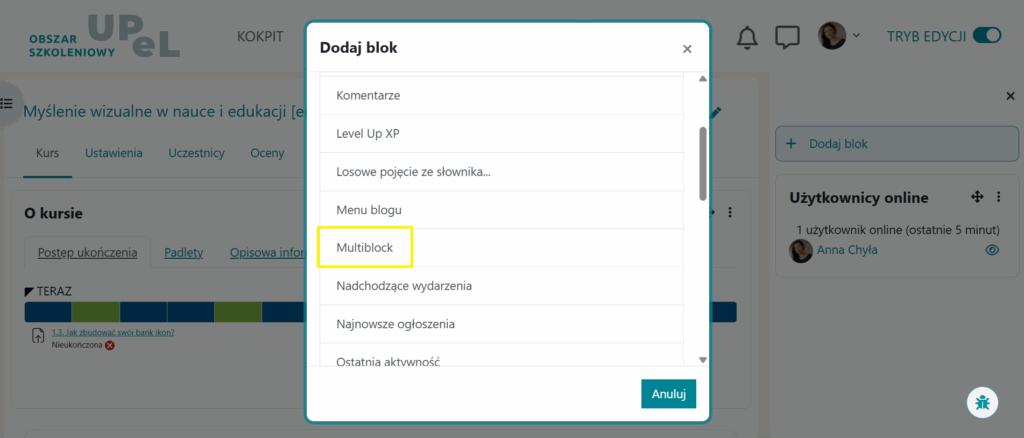 Jeśli chcesz umieścić multiblock na stronie głównej kliknij na krzyżyk ze strzałkami i przytrzymując przeciągnij w odpowiednie miejsce. Multiblock pojawi się powyżej pierwszego modułu kursu.