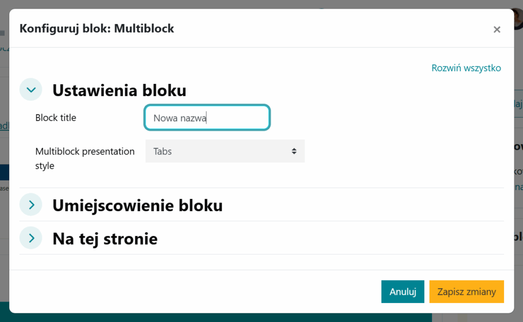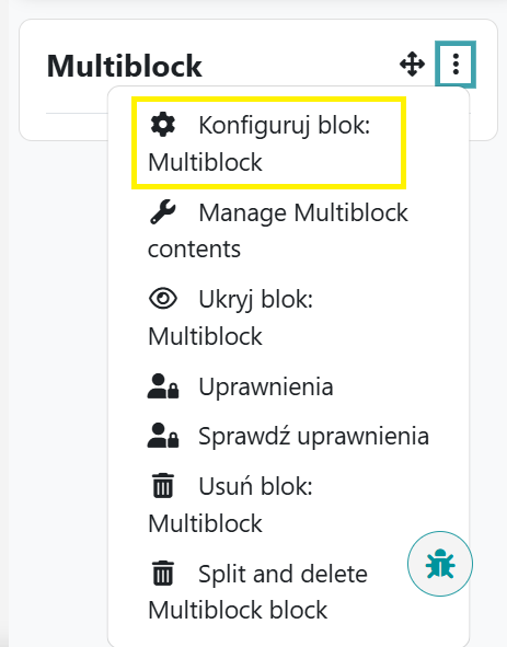 Po dodaniu zasobu kliknij w trzy kropki i rozwiń menu. Na początek wejdź w “Konfiguruj blok: Multiblock”.