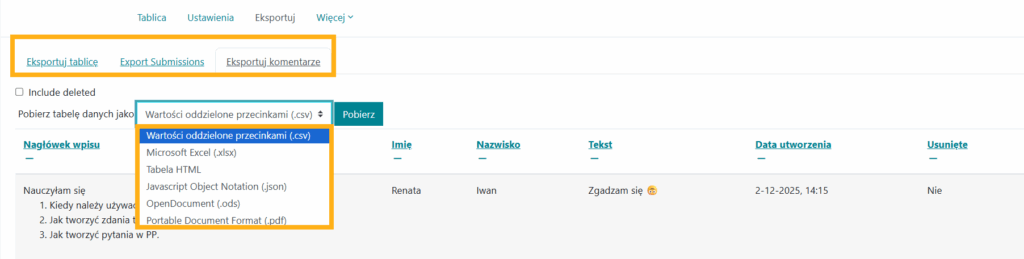 Po zakończeniu pracy na tablicy możesz ją eksportować bądź to w  całości, bądź to wpisy ze szczegółami kto, kiedy, linki, itp. bądź też same komentarze. Eksportu można dokonywać w różnych formatach.