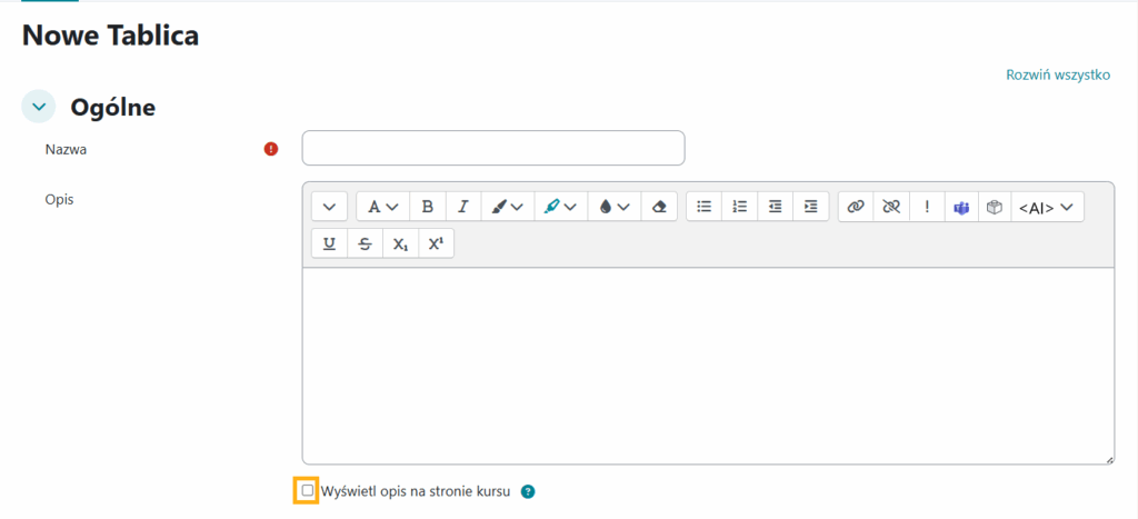 Wprowadź nazwę i opis oraz ustal czy opis ma wyświetlać się na stronie kursu (checkbox).
