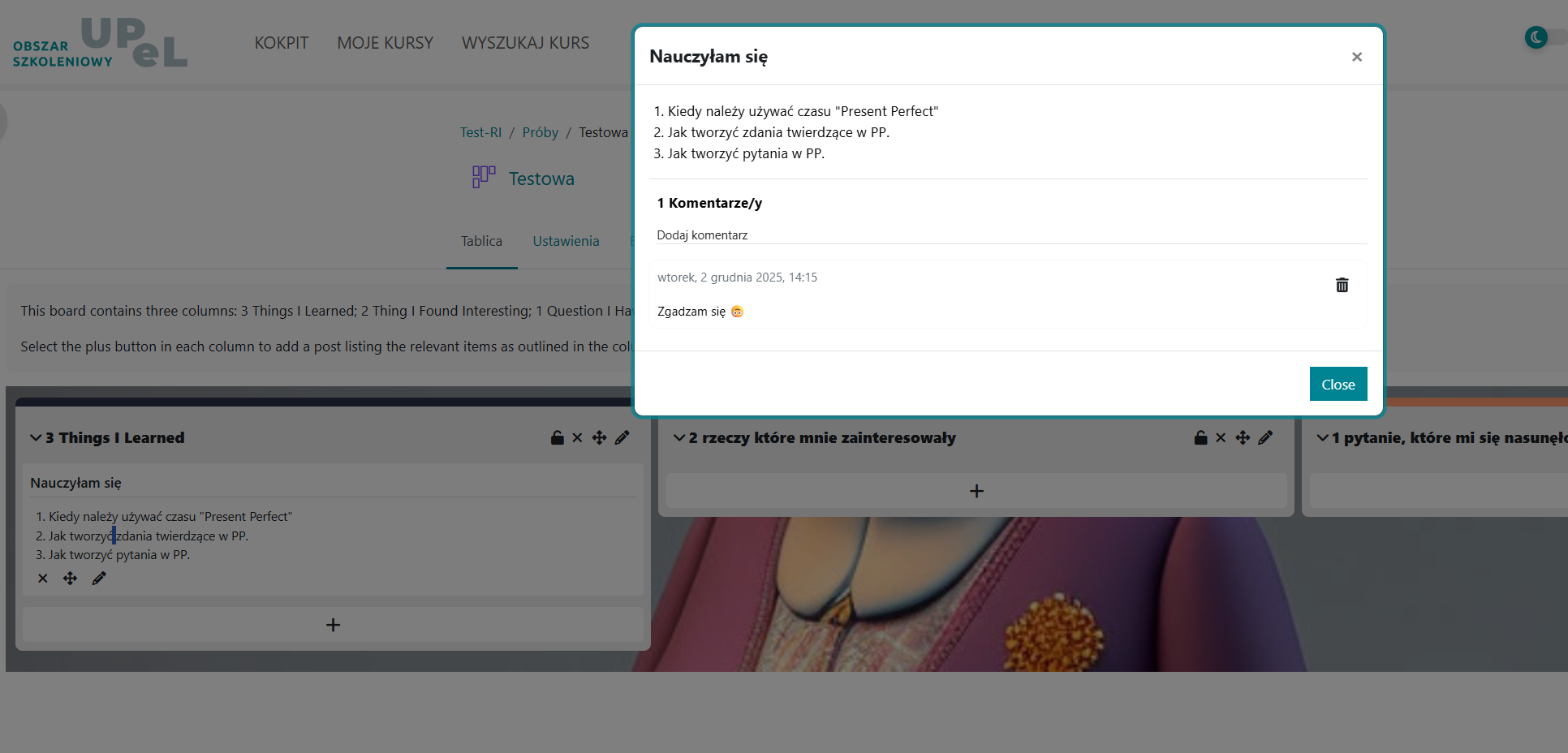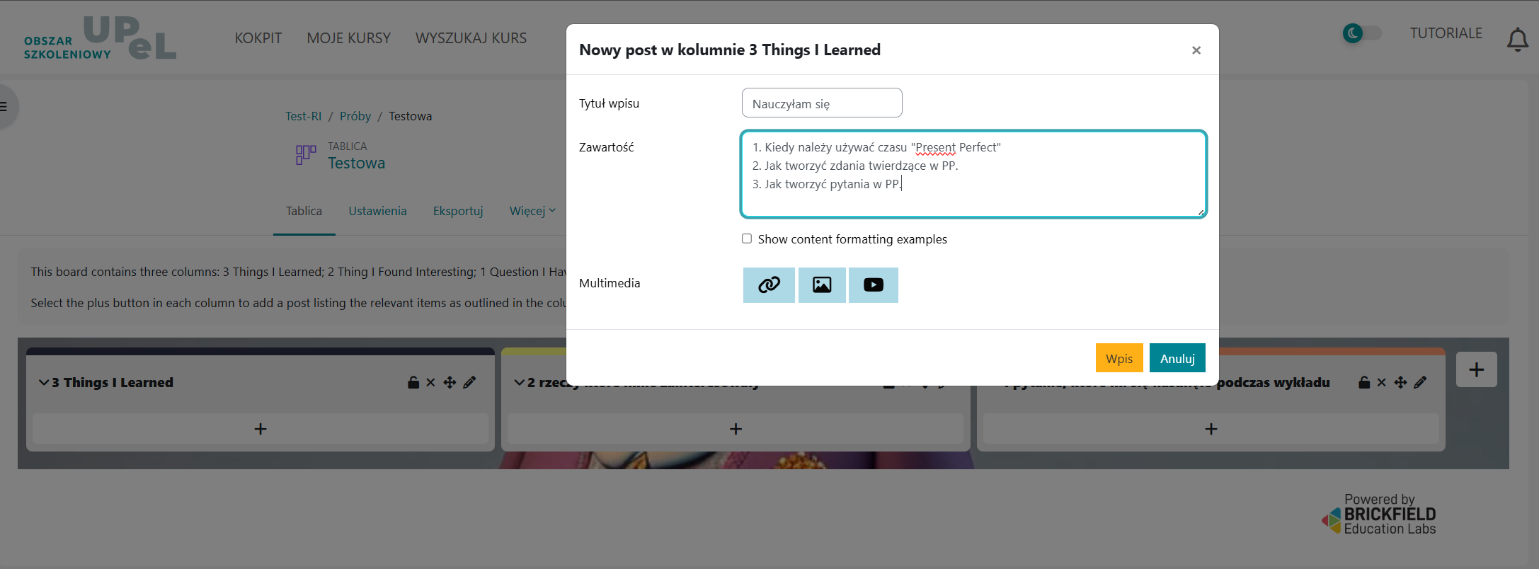Osoby studiujące mogą dodawać wpisy w wybranych kolumnach, a prowadzący_a może je moderować, oceniać, przesuwać lub blokować.