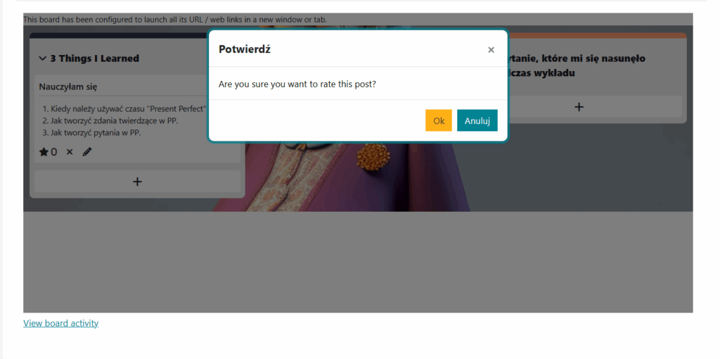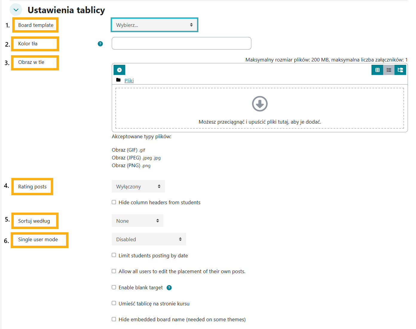 4. Ocena wpisów – jeśli włączona, to masz możliwość wyboru kto może oceniać wpisy  zamieszczone na tablicy: nauczyciele, uczniowie lub jedni i drudzy. Ocena wpisów [Rating Posts] w Tablicy Moodle/UPeL umożliwia ocenianie każdej karteczki osobno, ale nie jest to ‘pełne’ ocenianie. Możesz nadać wpisowi 1⭐ (wyróżnij) lub 0⭐ (usuń wyróżnienie). To nie jest ocena Moodle/UPeL – gwiazdka służy tylko do oznaczania ważnych lub ciekawych wpisów.