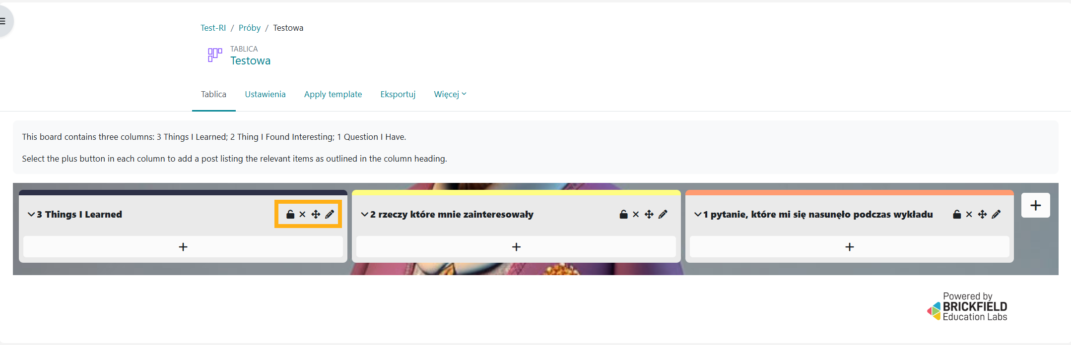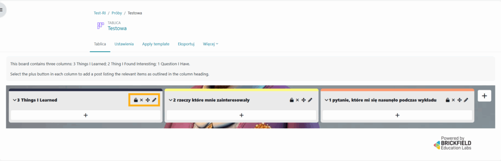 Poniżej zamieszczona została przykładowa tablica – po wykładzie możesz poprosić osoby studiujące by dodały wpisy pod każdą z kolumn. Ponieważ nazwy kolumn są w języku angielskim, więc warto je przetłumaczyć (chyba, że akurat prowadzisz zajęcia po angielsku – wtedy nie ma takiej potrzeby). Tłumaczenia możesz dokonać klikając w znaczek edycji – ostatni w rzędzie.
